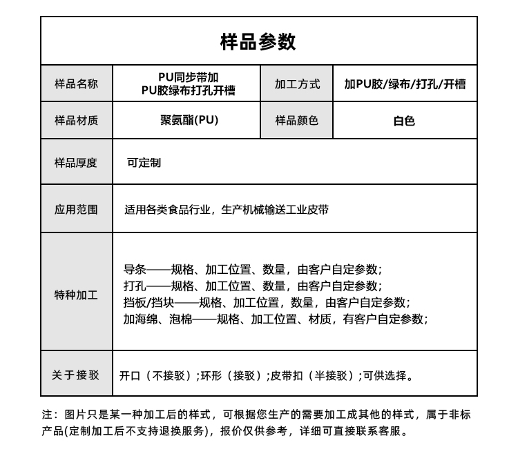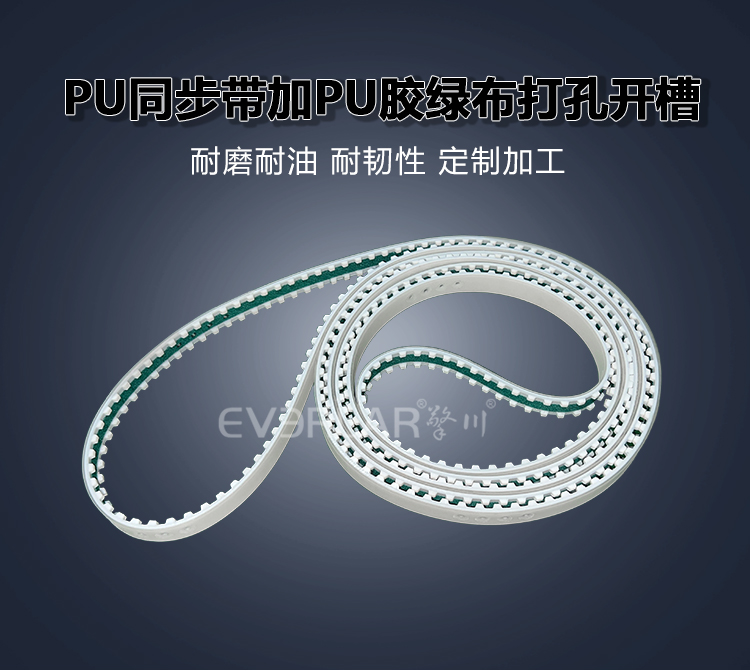 • 產(chǎn)品名稱:PU同步帶加PU膠綠布打孔開槽精準(zhǔn)傳動防滑包裝機械聚氨酯工業(yè)皮帶定制